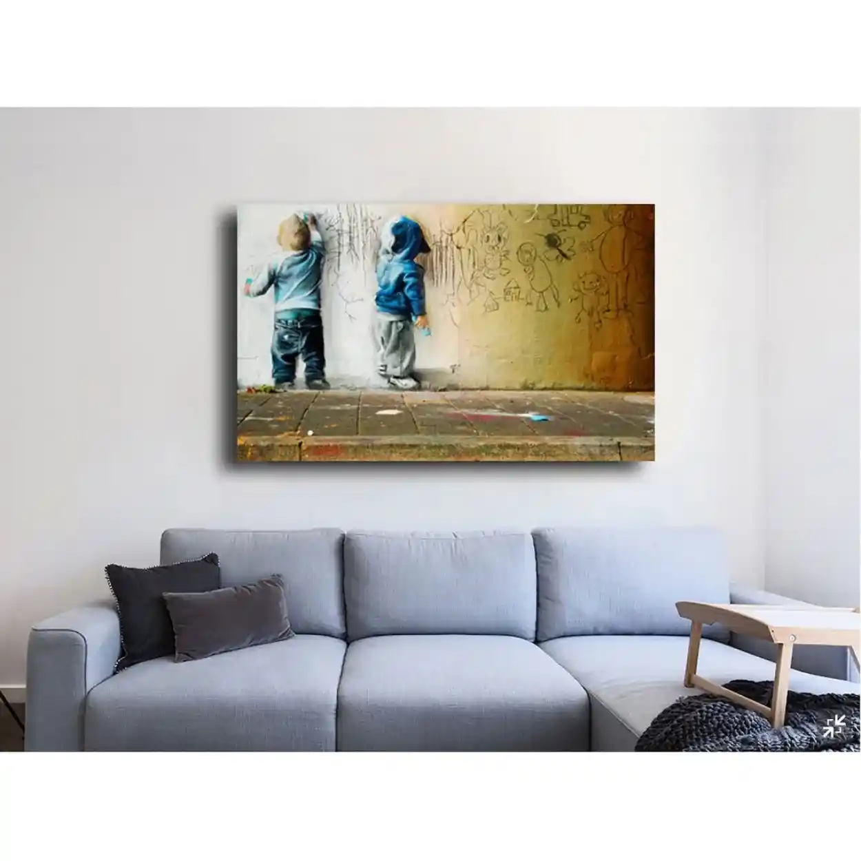 Your canvas art print arrives ready to hang, with hanging accessories included and no additional framing required. Every canvas print is hand-crafted in the USA and made on demand. Every piece of art is expertly stretched around 100% North American Pine wood stretcher bars. We only use industry-leading archival Roland inks to achieve the most vivid and high-definition prints possible. This heartwarming and slightly nostalgic piece captures the spirit of innocence and street creativity, featuring two young kids drawing on a wall in a style reminiscent of Banksy or other prominent Urban Street Artists. Please review the gallery images that show the back side of the artwork. Exterior Frames and Floater Frames are available in your options.