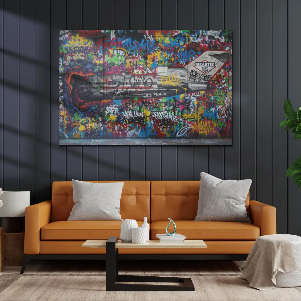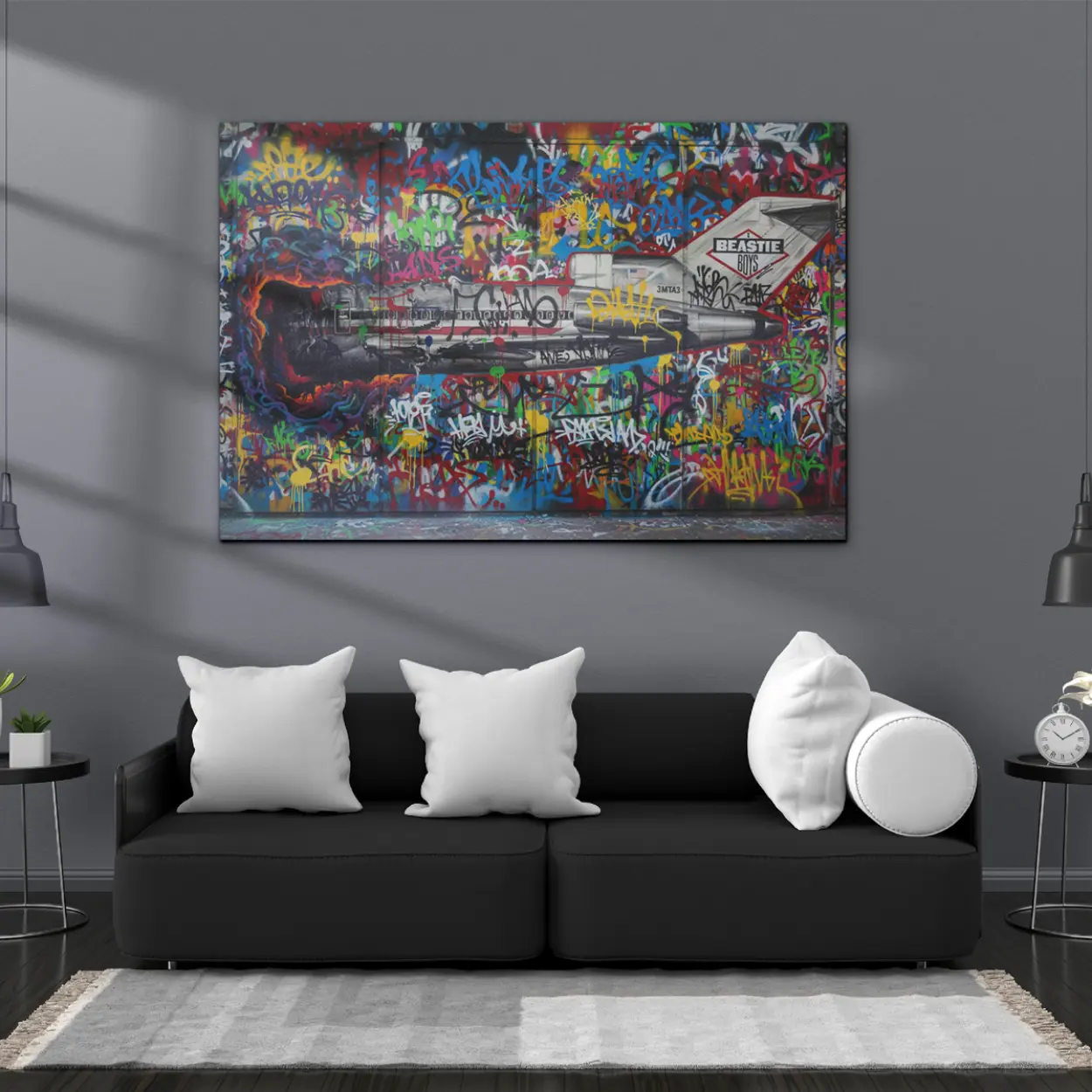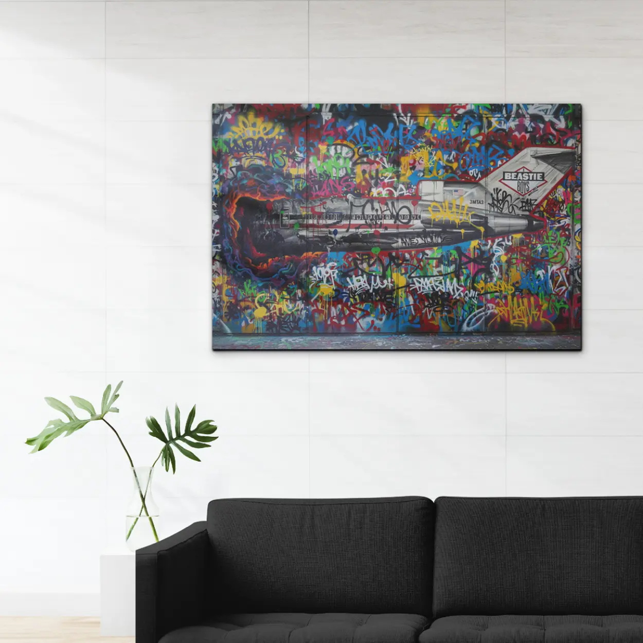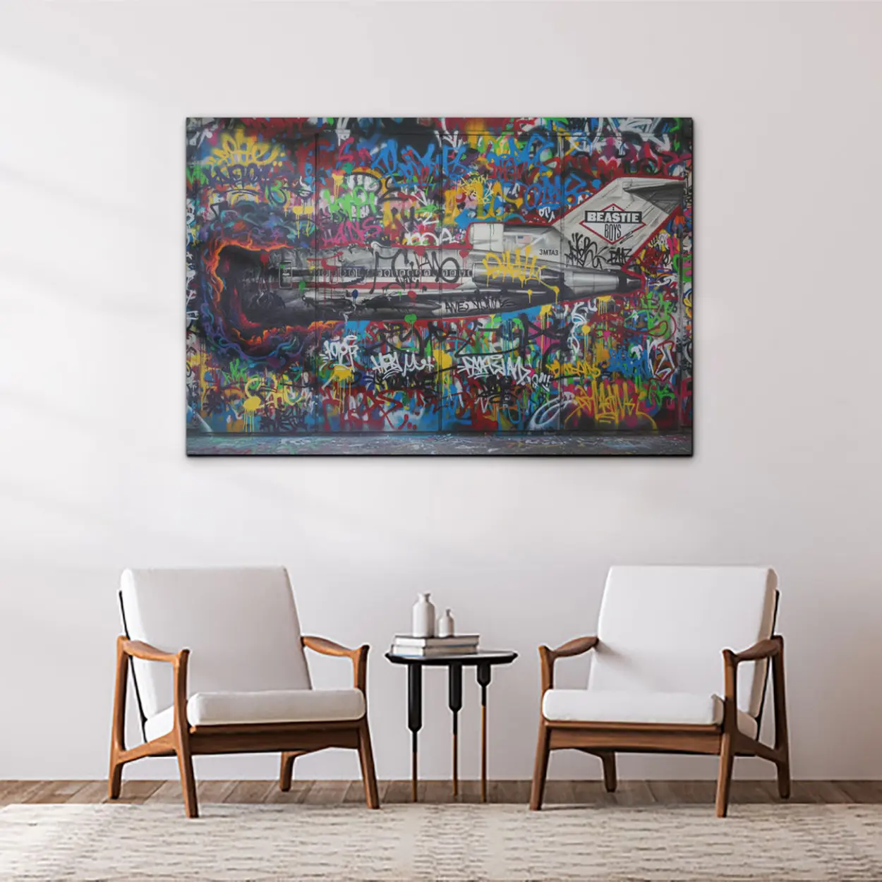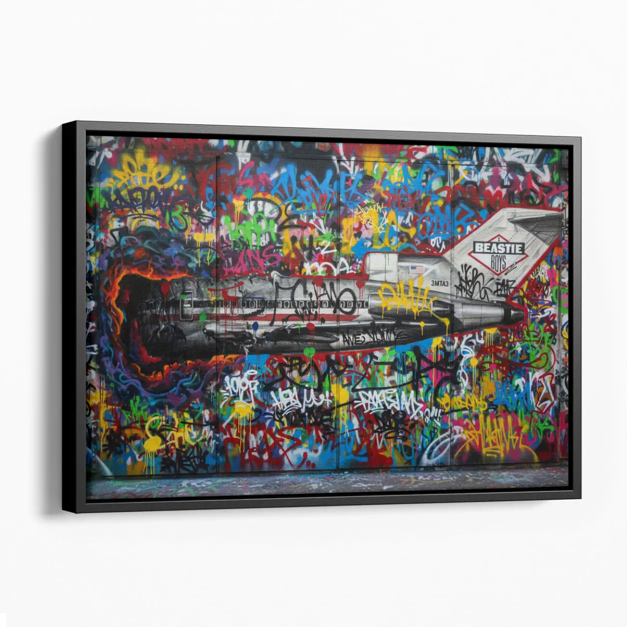 Your canvas art print arrives ready to hang, with hanging accessories included and no additional framing required. Every canvas print is hand-crafted in the USA and made on demand. Every piece of art is expertly stretched around 100% North American Pine wood stretcher bars to ensure a straight, warp-resistant finish. We only use industry-leading archival Roland inks to achieve the most vivid and high-definition prints possible, ensuring your tribute to the kings of New York remains vibrant for decades. This original design features a bold remake of the legendary Licensed to Ill Boeing 727, set against an explosive backdrop of colorful tags, gritty drips, and authentic urban elements. Please review the gallery images that show the back side of the artwork. Exterior Frames and Floater Frames are available in your options.