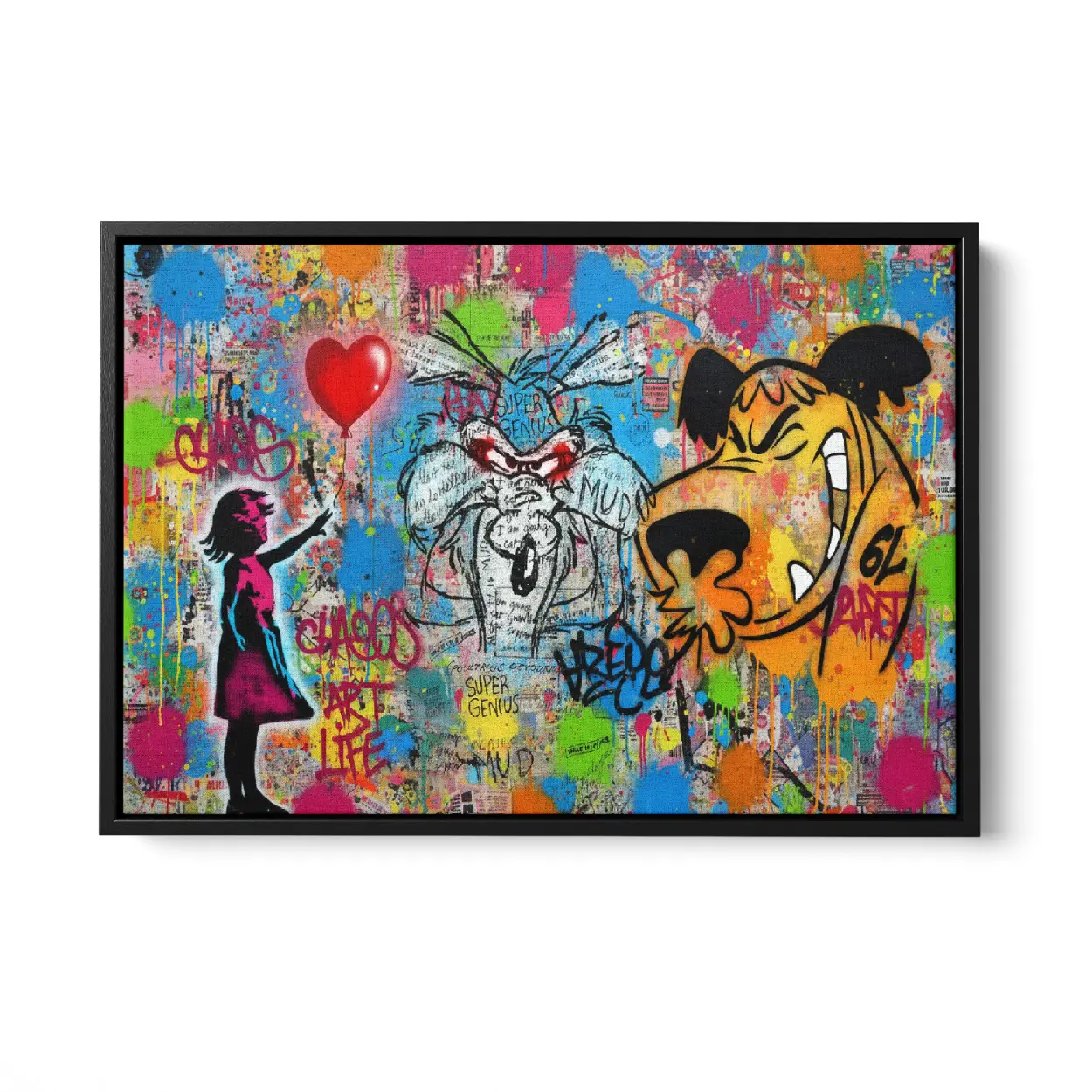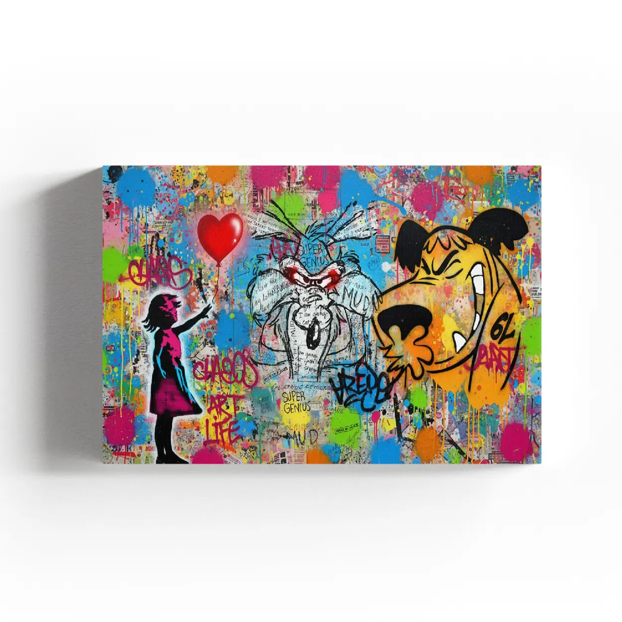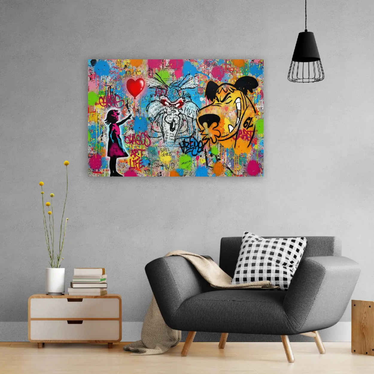 Cartoon Mashup Graffiti Canvas Art – Ready to Hang HD Canvas – Pop Culture Icons Original Mutley, Wile E. Coyote, & Balloon Girl Art – Ready to Hang Street Art