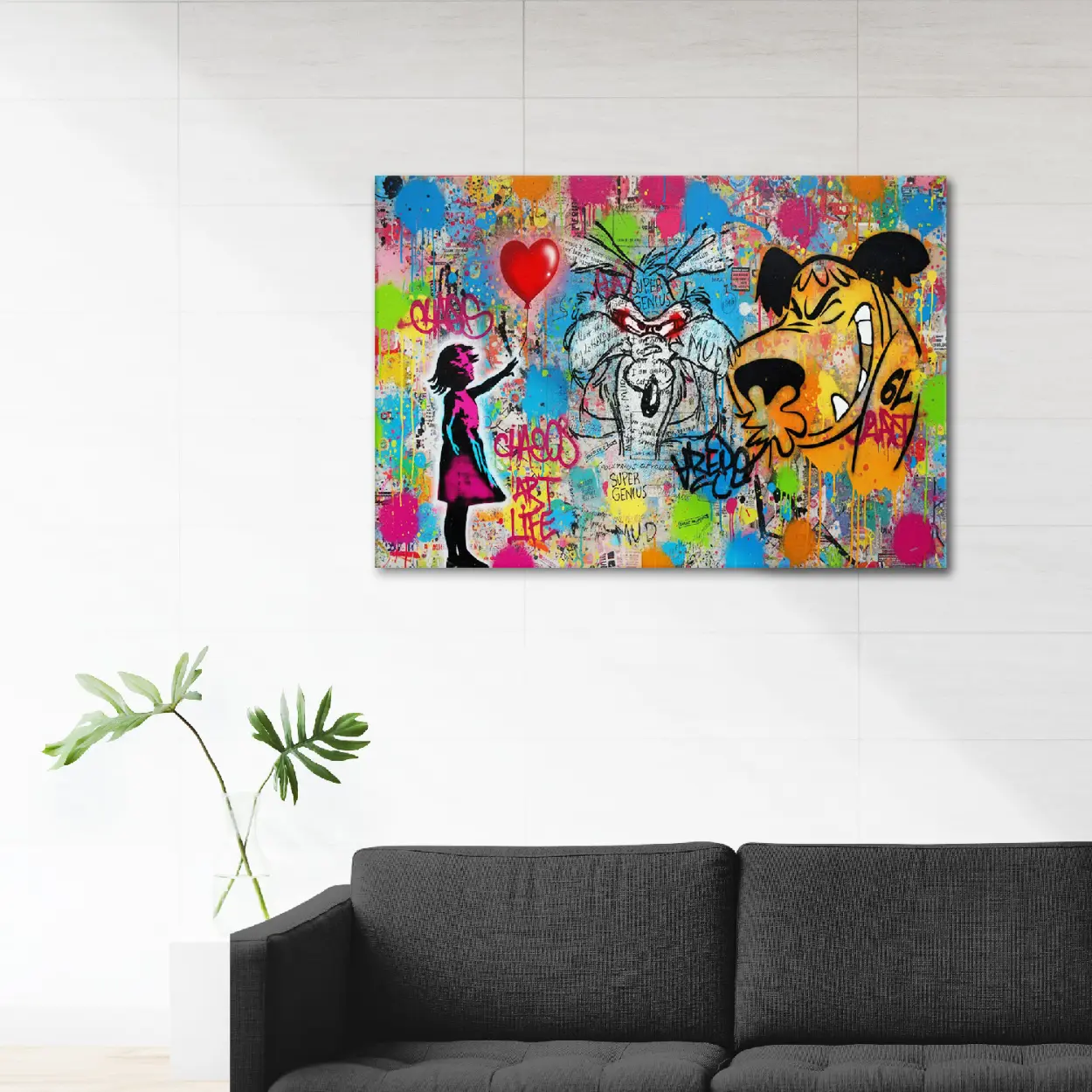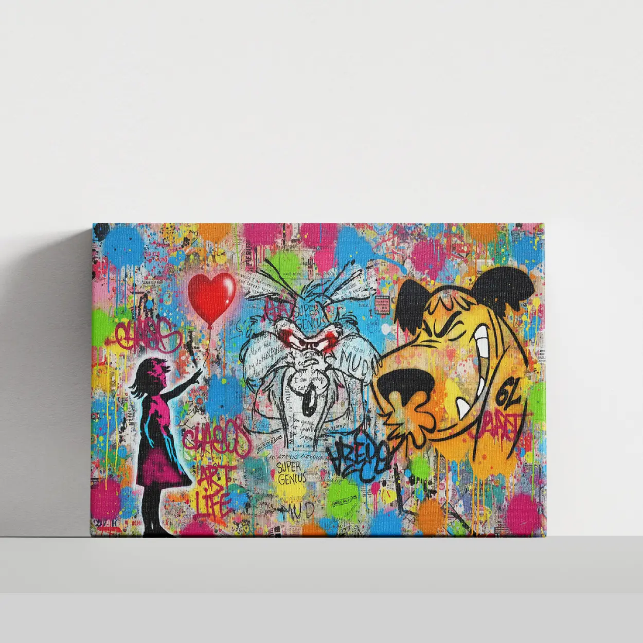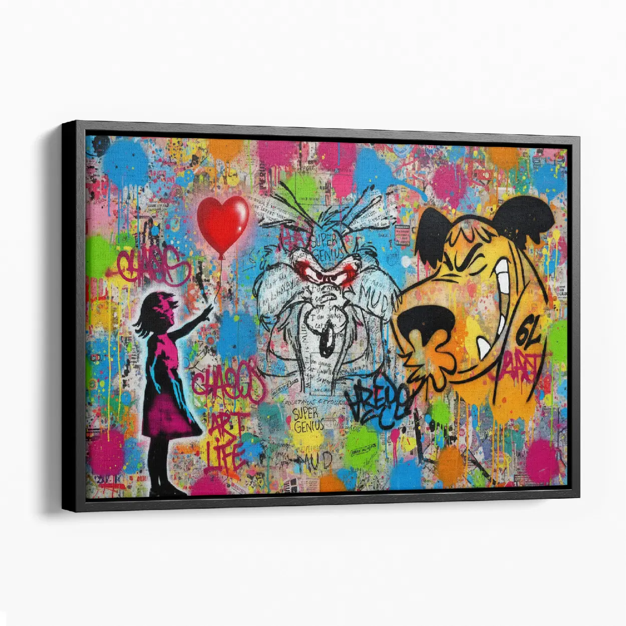 Cartoon Mashup Graffiti Canvas Art – Ready to Hang HD Canvas – Pop Culture Icons Original Mutley, Wile E. Coyote, & Balloon Girl Art – Ready to Hang Street Art