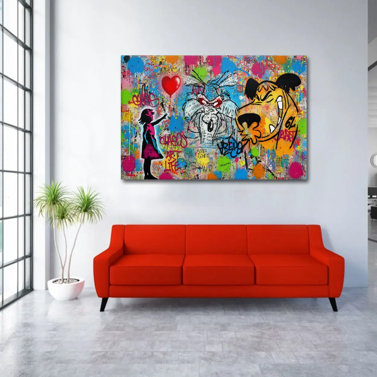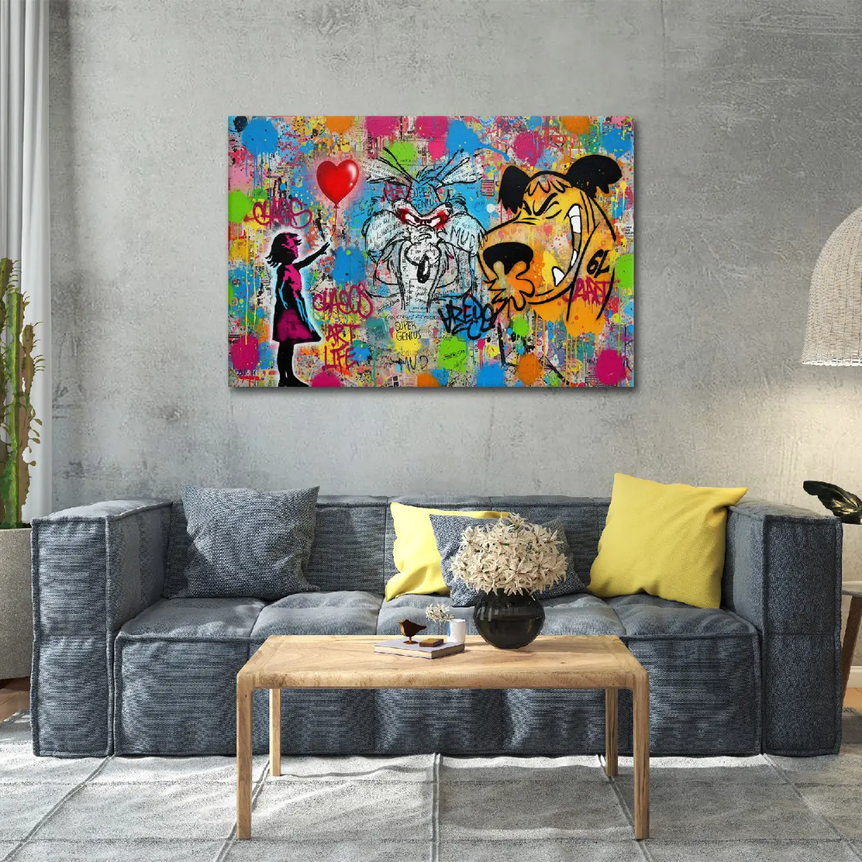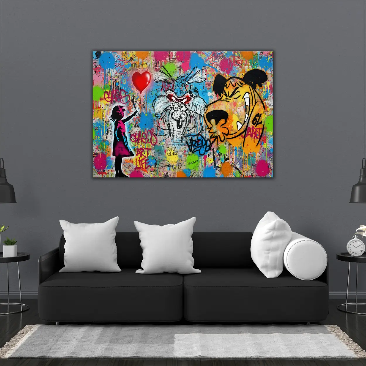 Perfect for pop culture enthusiasts, cartoon fans, modern home decor, and collectors of Banksy-inspired street art.