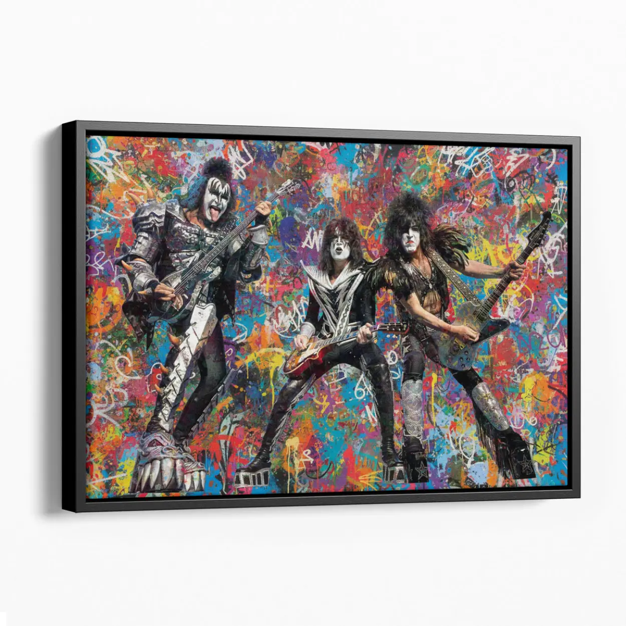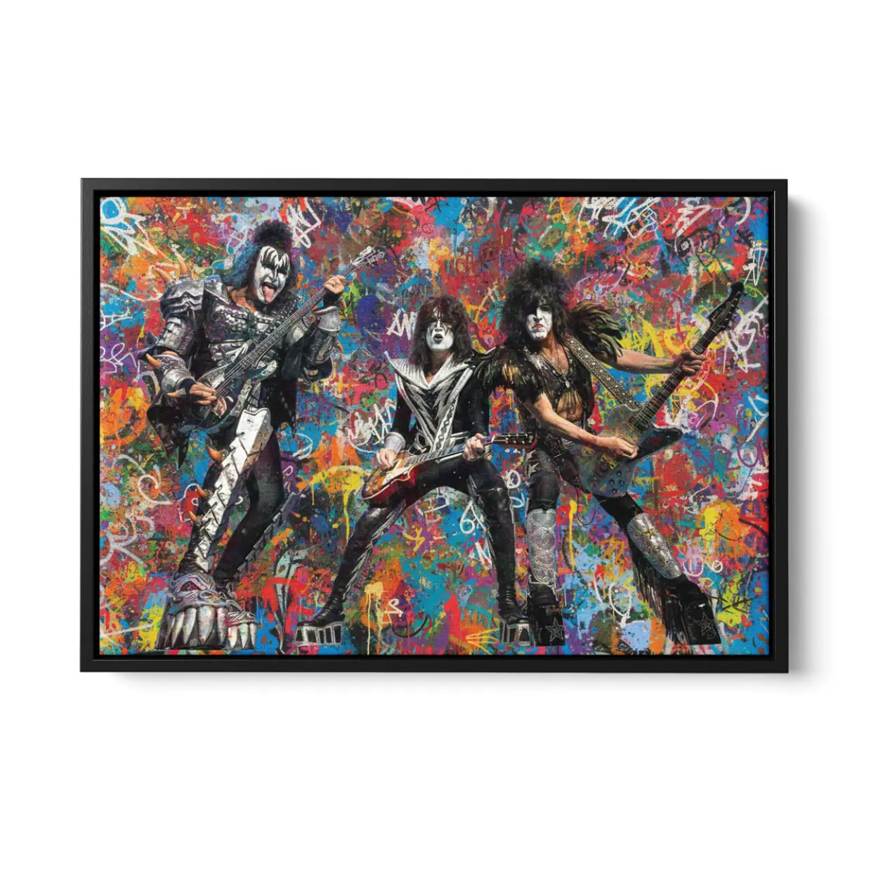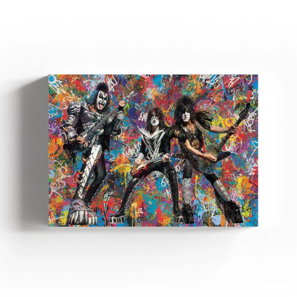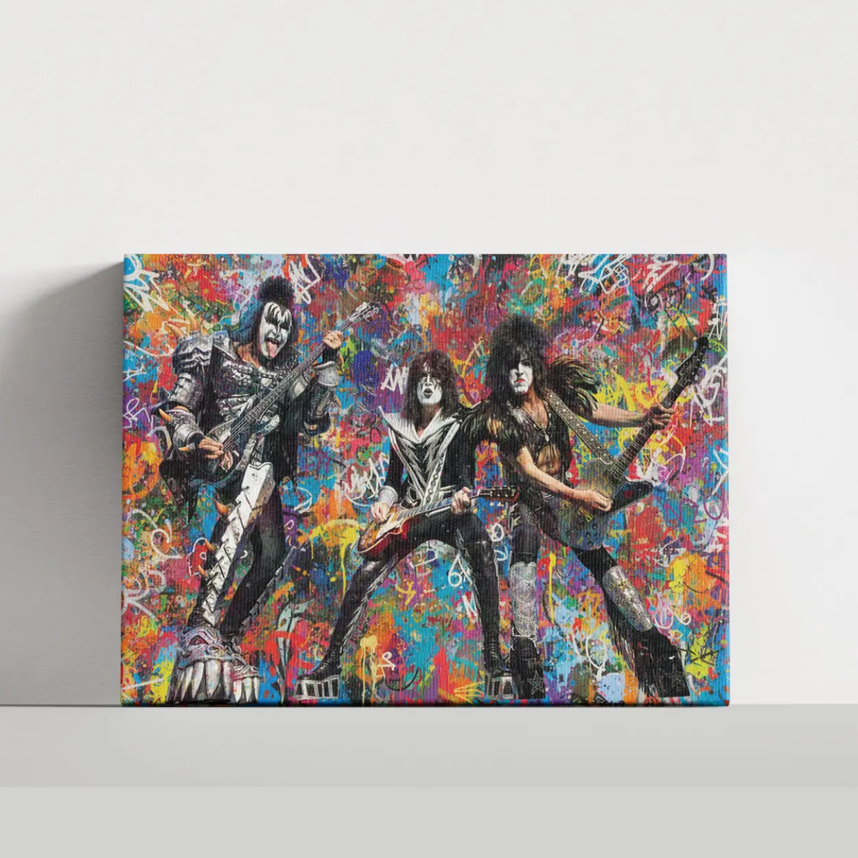 Your canvas art print arrives ready to hang, with hanging accessories included and no additional framing required. Every canvas print is hand-crafted in the USA and made on demand. Every piece of art is expertly stretched around 100% North American Pine wood stretcher bars to ensure a straight, warp-resistant finish. We only use industry-leading archival Roland inks to achieve the most vivid and high-definition prints possible, ensuring the band’s iconic makeup and silver-studded costumes stay vibrant for decades. This original design features the legendary rockers mid-performance, set against an explosive backdrop of colorful graffiti drips, spray-paint textures, and gritty urban tags. Please review the gallery images that show the back side of the artwork. Exterior Frames and Floater Frames are available in your options.