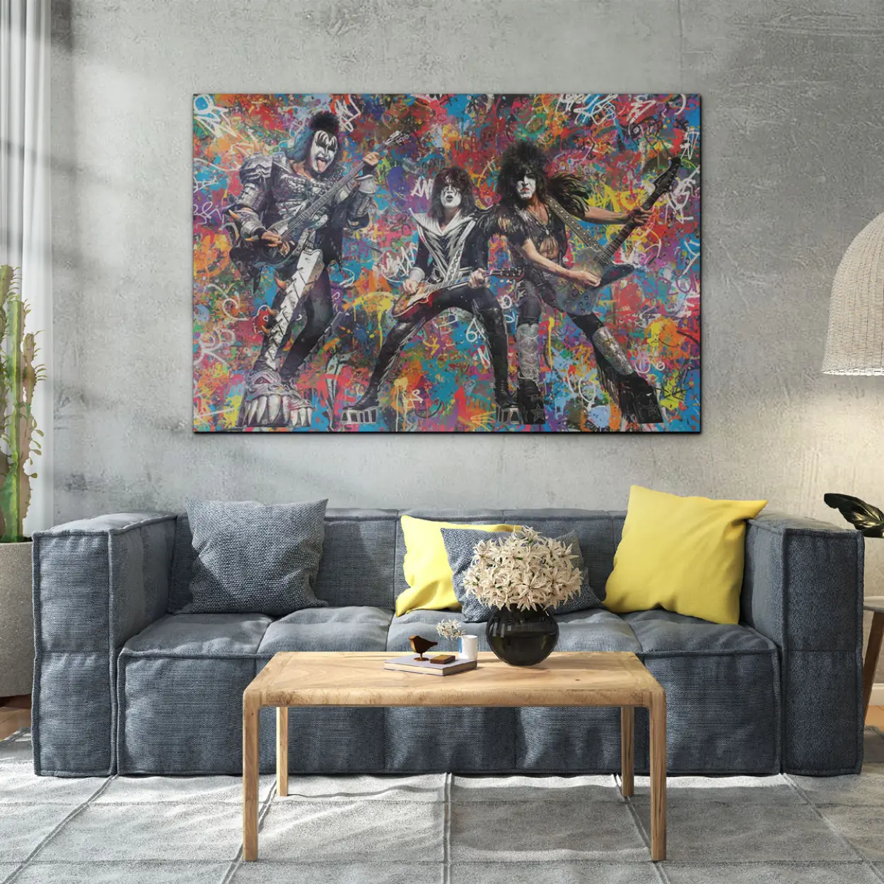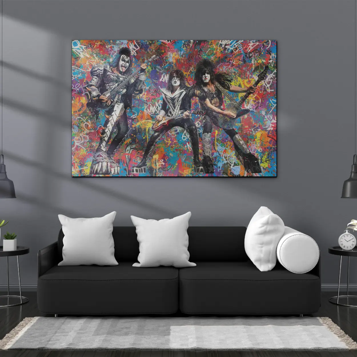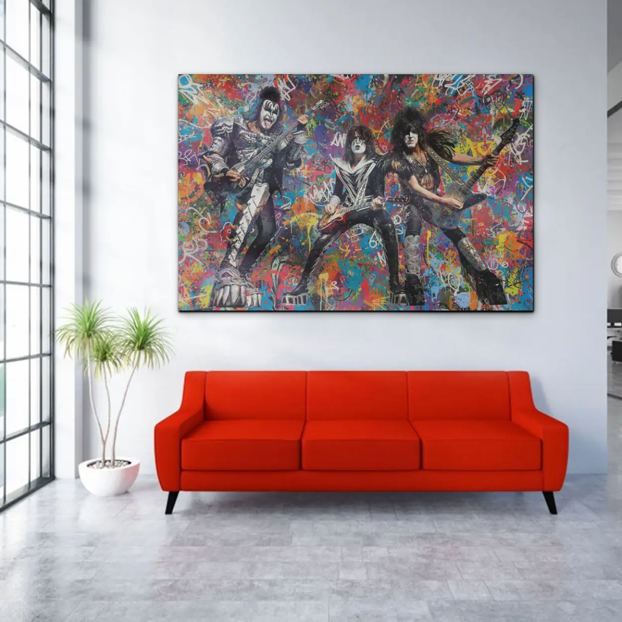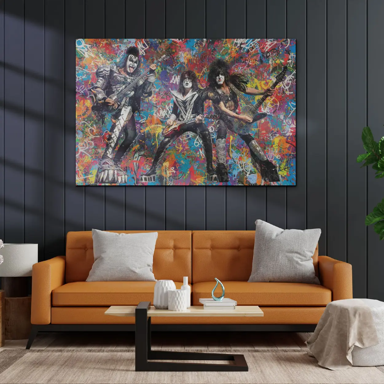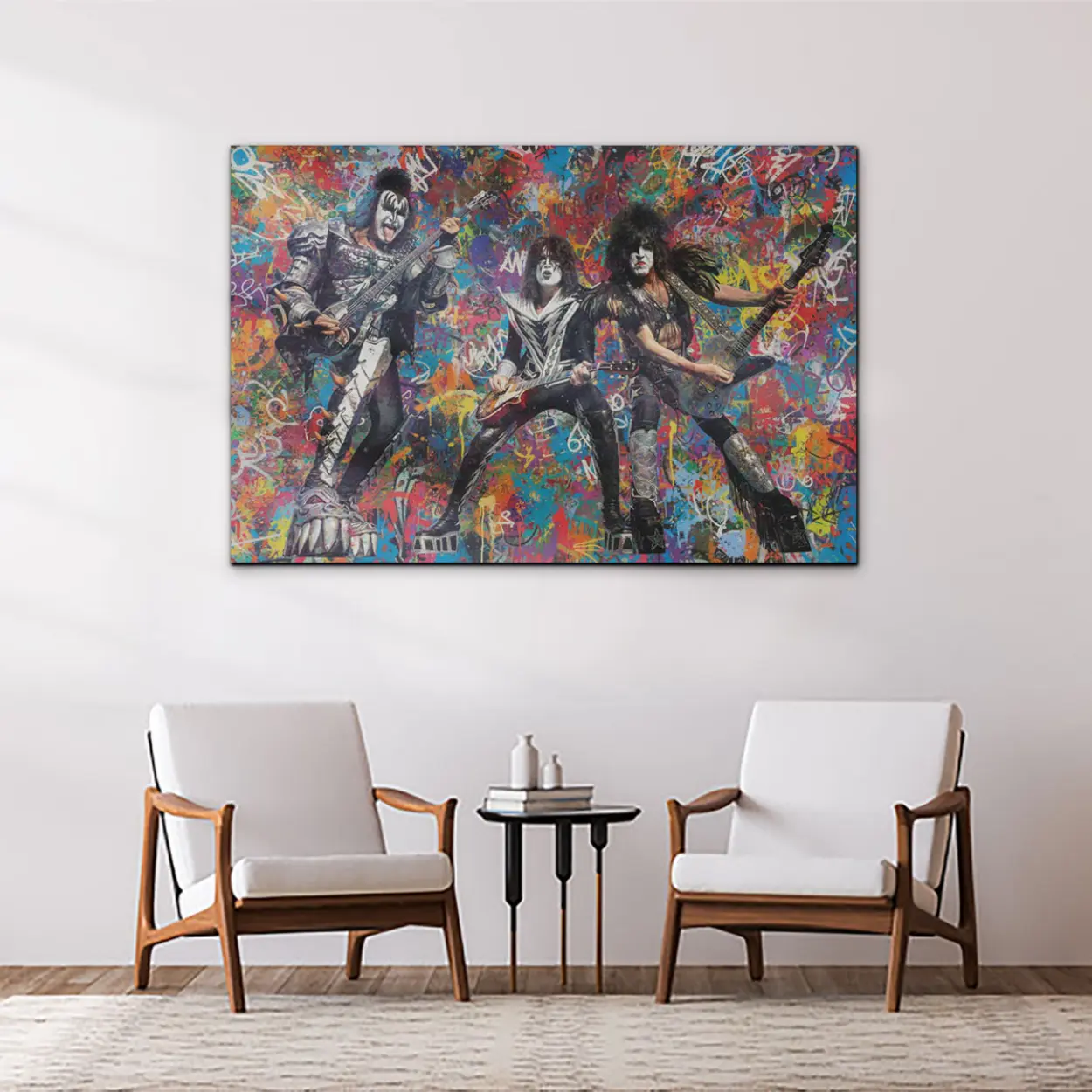 Your canvas art print arrives ready to hang, with hanging accessories included and no additional framing required. Every canvas print is hand-crafted in the USA and made on demand. Every piece of art is expertly stretched around 100% North American Pine wood stretcher bars to ensure a straight, warp-resistant finish. We only use industry-leading archival Roland inks to achieve the most vivid and high-definition prints possible, ensuring the band’s iconic makeup and silver-studded costumes stay vibrant for decades. This original design features the legendary rockers mid-performance, set against an explosive backdrop of colorful graffiti drips, spray-paint textures, and gritty urban tags. Please review the gallery images that show the back side of the artwork. Exterior Frames and Floater Frames are available in your options.