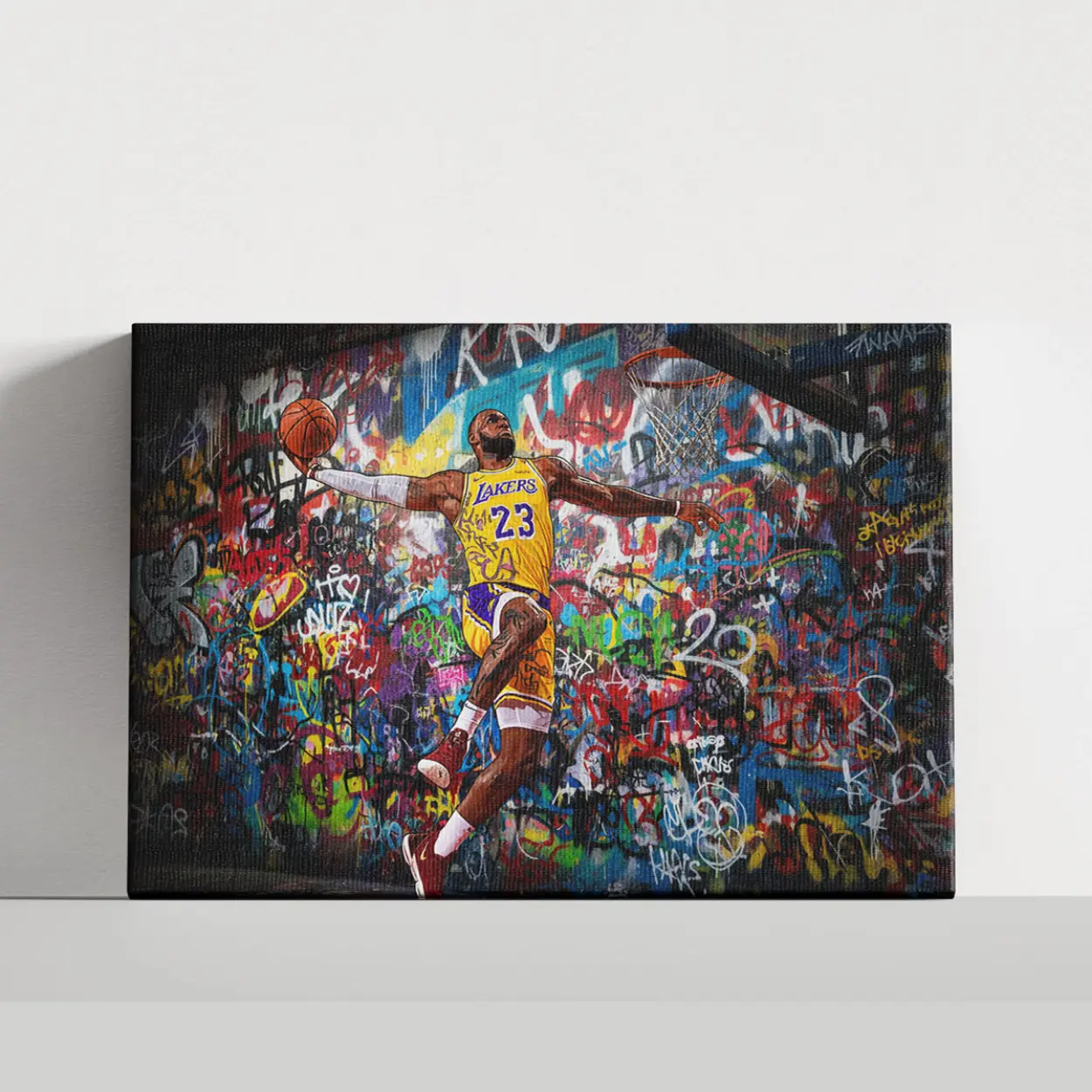Your canvas art print arrives ready to hang, with hanging accessories included and no additional framing required. Every canvas print is hand-crafted in the USA and made on demand. Every piece of art is expertly stretched around 100% North American Pine wood stretcher bars. We only use industry-leading archival Roland inks to achieve the most vivid and high-definition prints possible. This original design features LeBron James in his iconic #23 jersey, mid-flight against a backdrop of authentic spray-paint drips, layered graffiti tags, and gritty urban textures. Please review the gallery images that show the back side of the artwork. Exterior Frames and Floater Frames are available in your options.