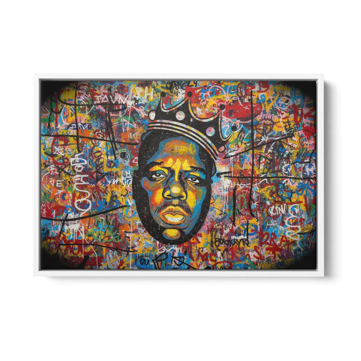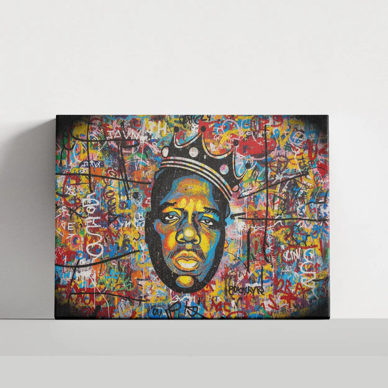 Your canvas art print arrives ready to hang, with hanging accessories included and no additional framing required. Every canvas print is hand-crafted in the USA and made on demand. Every piece of art is expertly stretched around 100% North American Pine wood stretcher bars to ensure a straight, warp-resistant finish. We only use industry-leading archival Roland inks to achieve the most vivid and high-definition prints possible, ensuring your tribute to the rap icon remains vibrant for years to come. This original design features a powerful composition of urban motifs, flamboyant typography, and iconic symbols like crowns and musical notes, all woven into a visually arresting tapestry. Please review the gallery images that show the back side of the artwork. Exterior Frames and Floater Frames are available in your options.