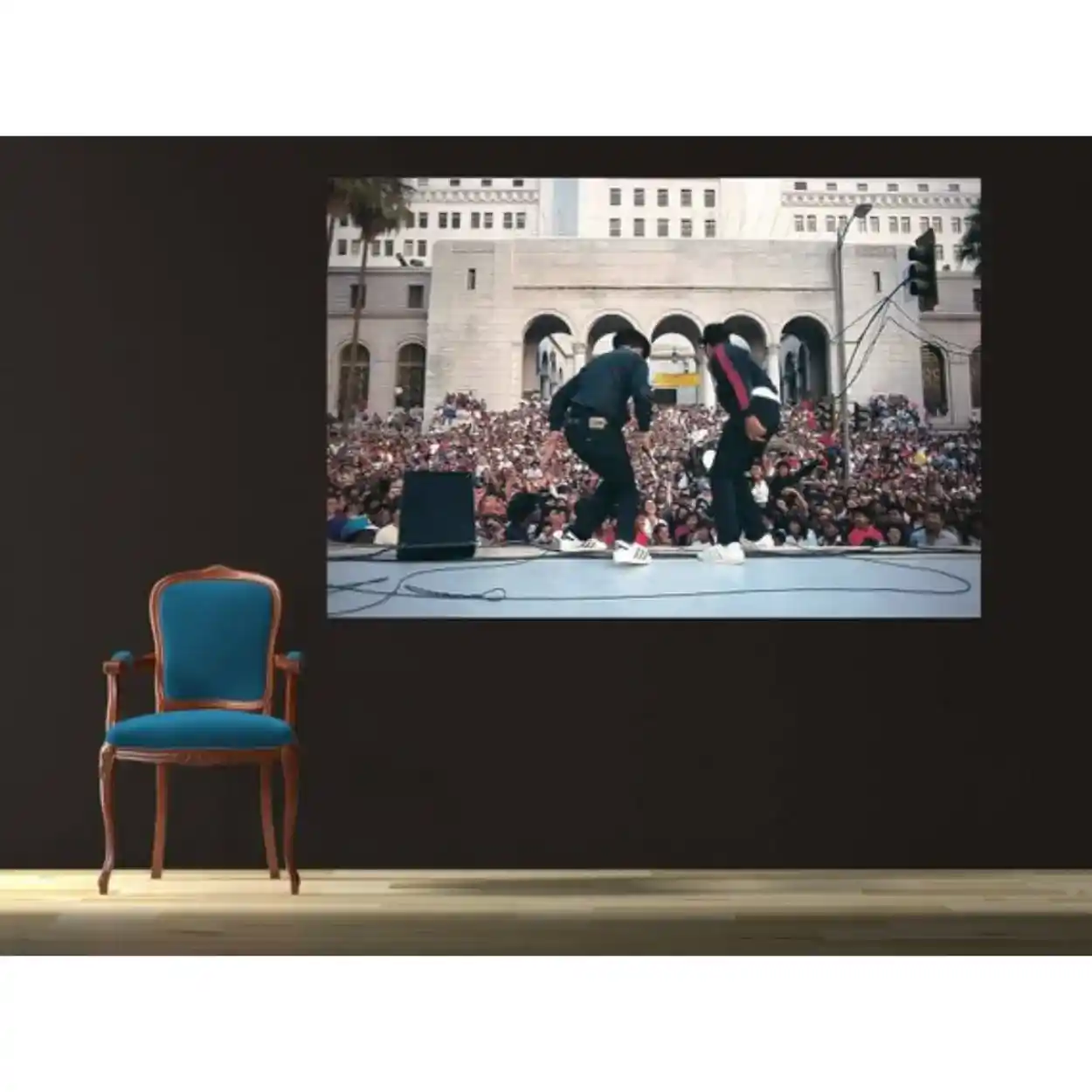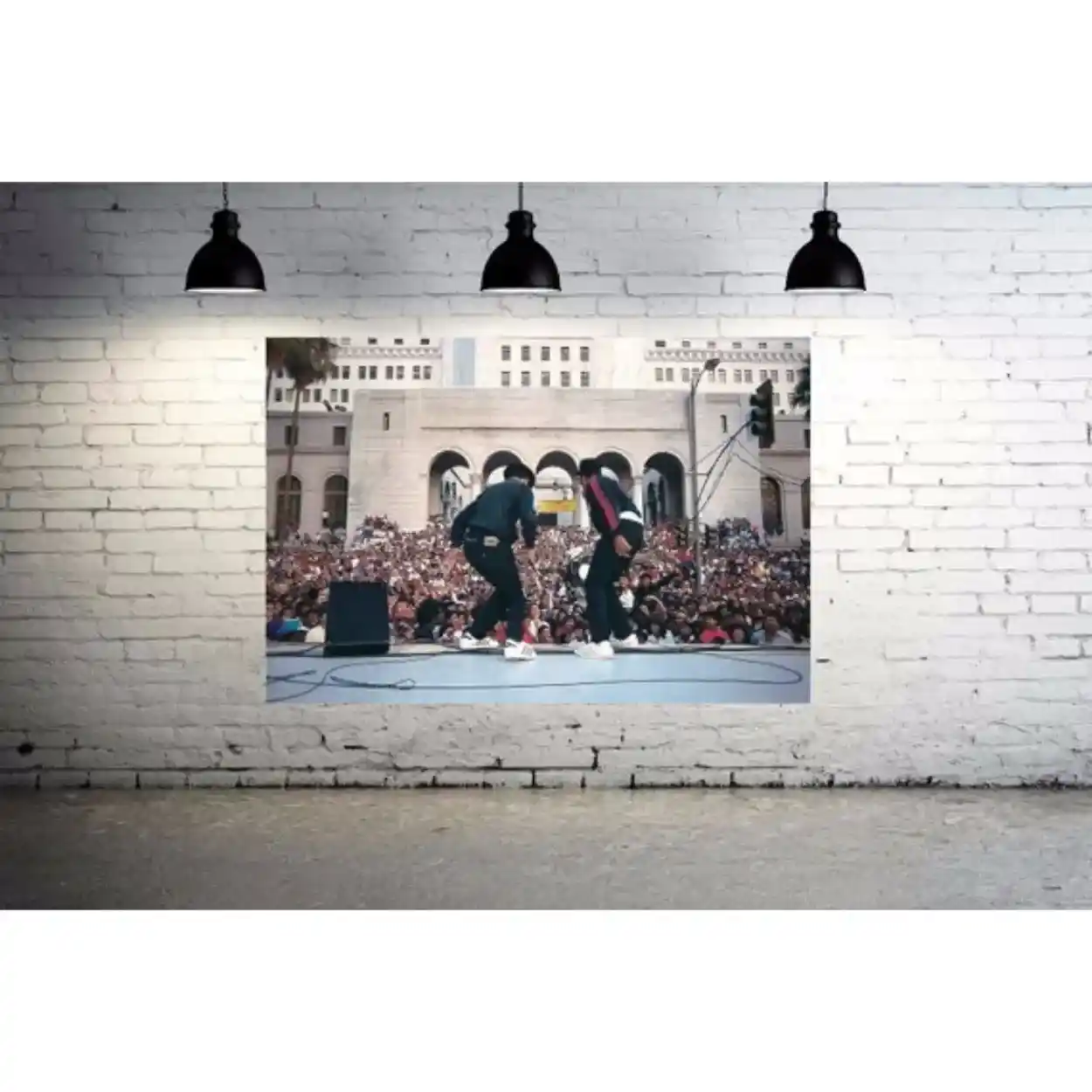 Your canvas art print arrives ready to hang, with hanging accessories included and no additional framing required. Every canvas print is hand-crafted in the USA and made on demand. Every piece of art is expertly stretched around 100% North American Pine wood stretcher bars. We only use industry-leading archival Roland inks to achieve the most vivid and high-definition prints possible. This historic photograph captures RUN DMC—legends of Old School Hip Hop—performing live in Downtown LA in front of a massive crowd. Please review the gallery images that show the back side of the artwork. Exterior Frames and Floater Frames are available in your options.