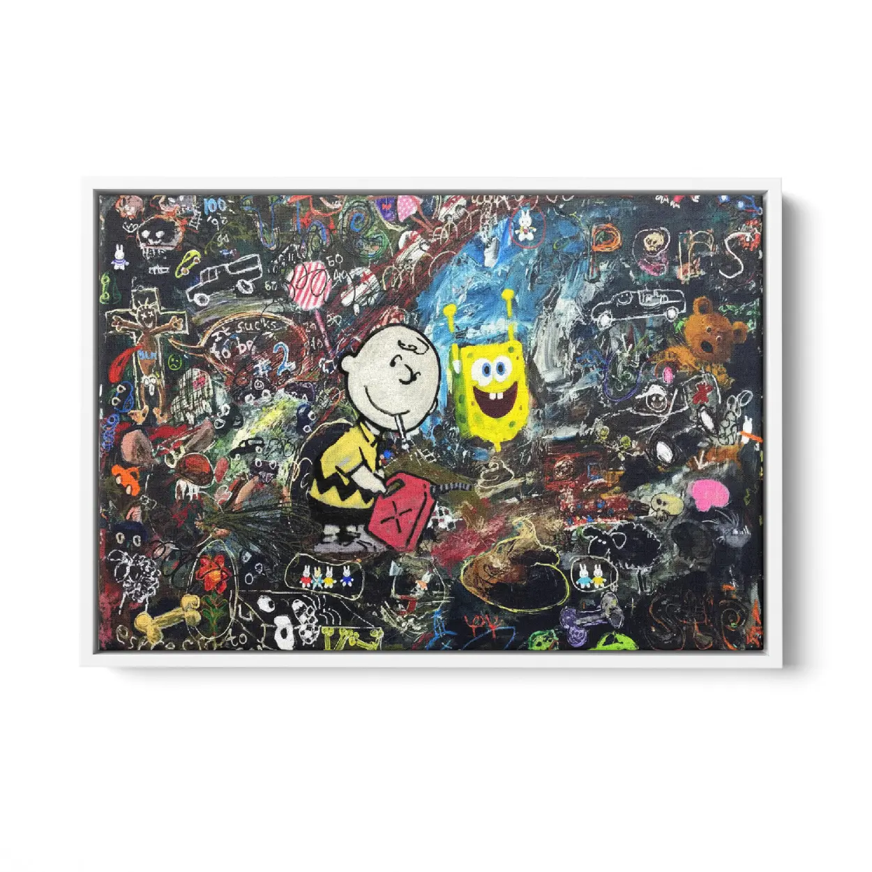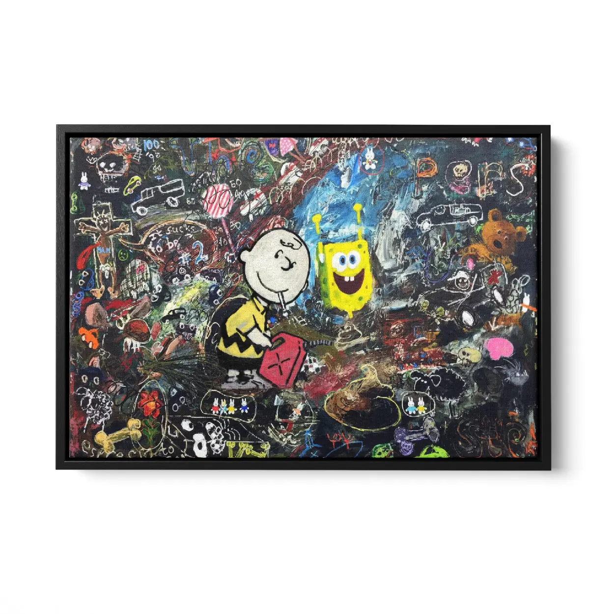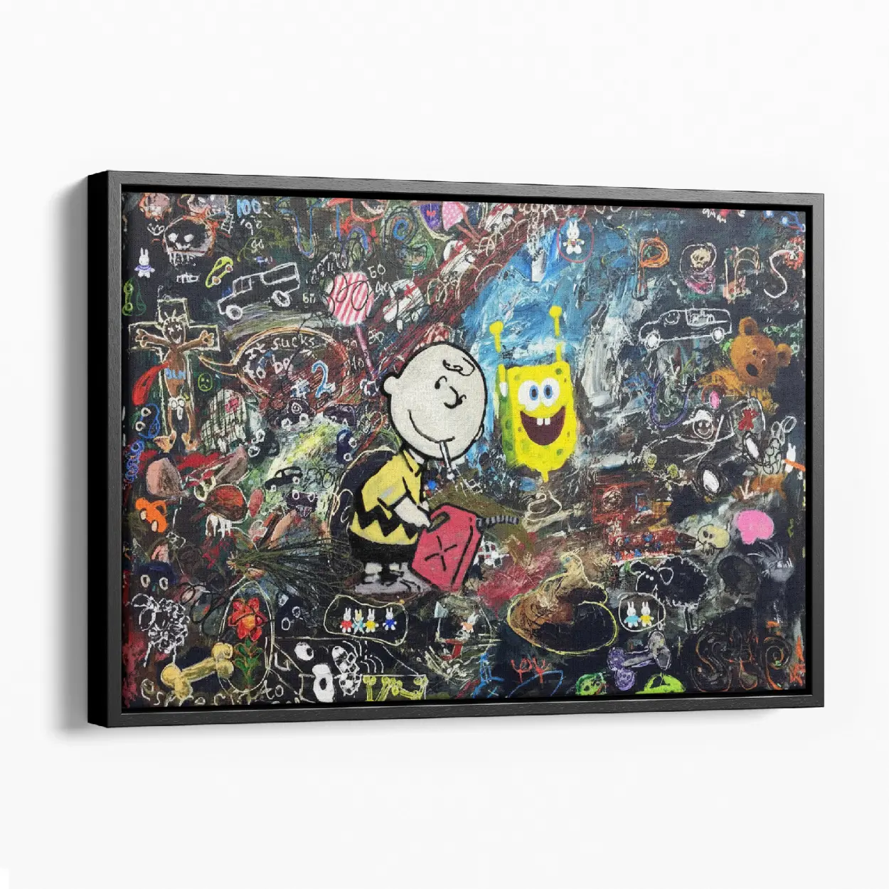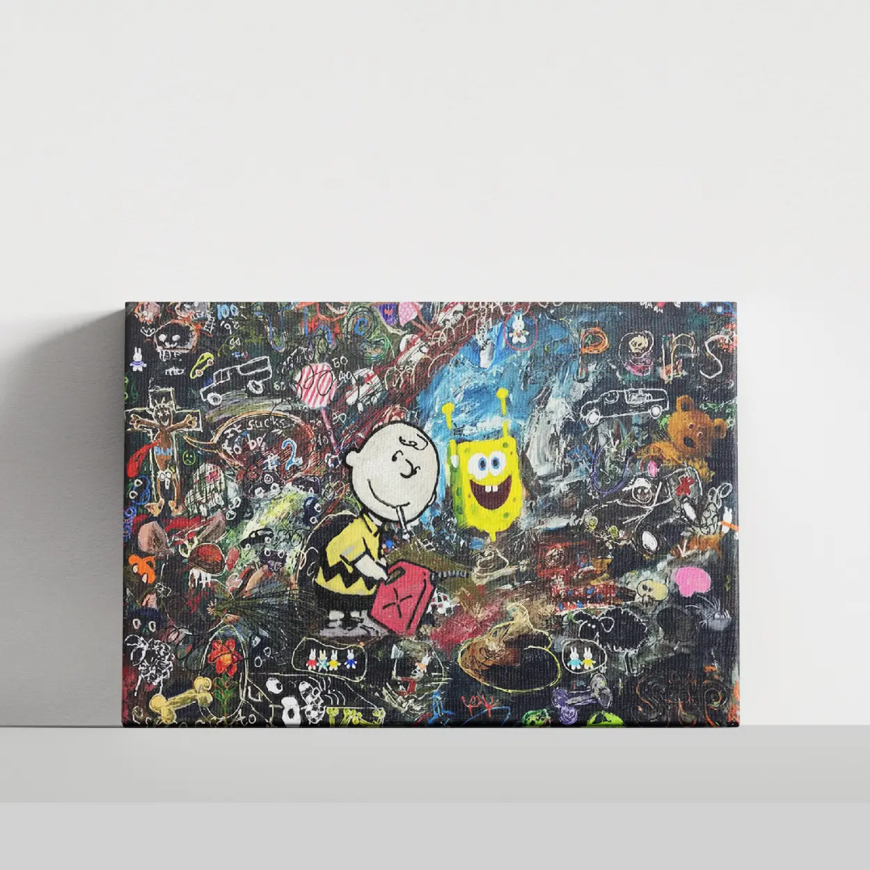 Classic meets modern chaos! This stunning SpongeBob and Chuck Graffiti Canvas Art Print combines the innocent melancholy of Charlie Brown with the whimsical energy of SpongeBob SquarePants. A unique, humorous, and provocative piece of Banksy-style street art perfect for any pop culture collection.