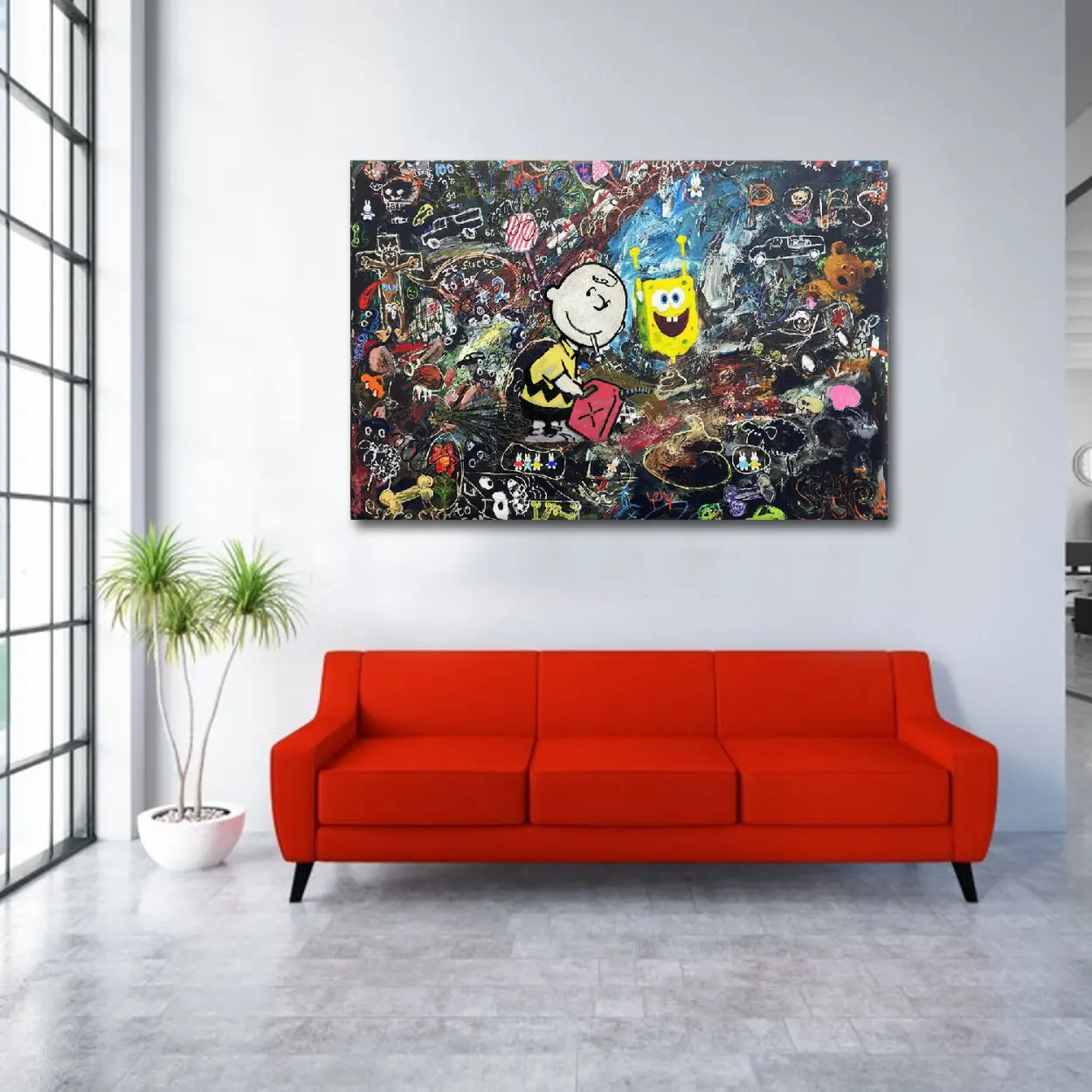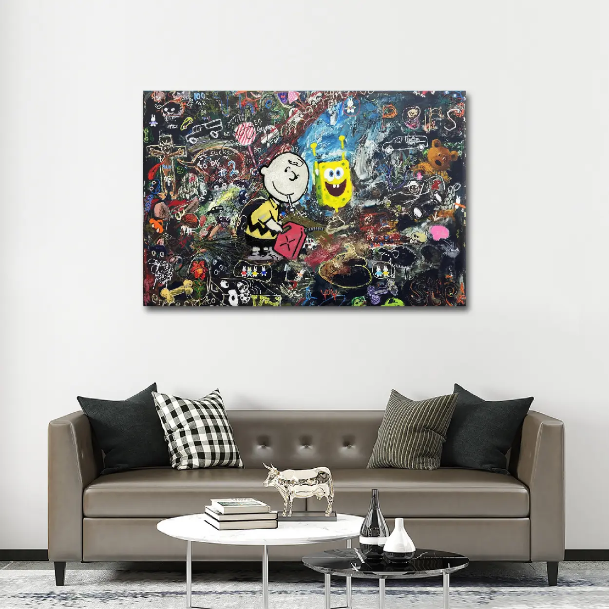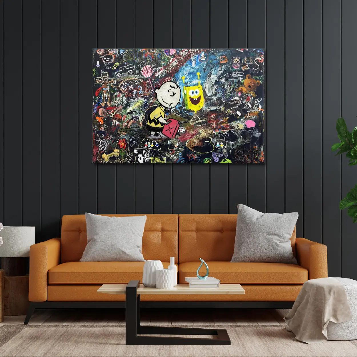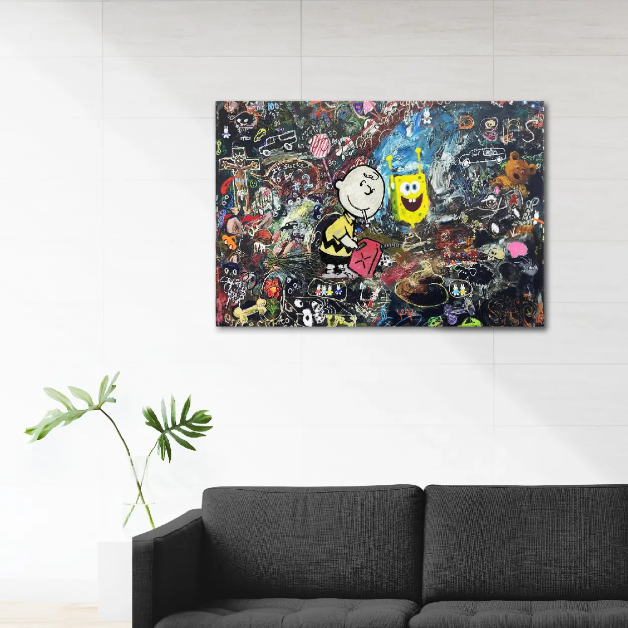 Classic meets modern chaos! This stunning SpongeBob and Chuck Graffiti Canvas Art Print combines the innocent melancholy of Charlie Brown with the whimsical energy of SpongeBob SquarePants. A unique, humorous, and provocative piece of Banksy-style street art perfect for any pop culture collection.