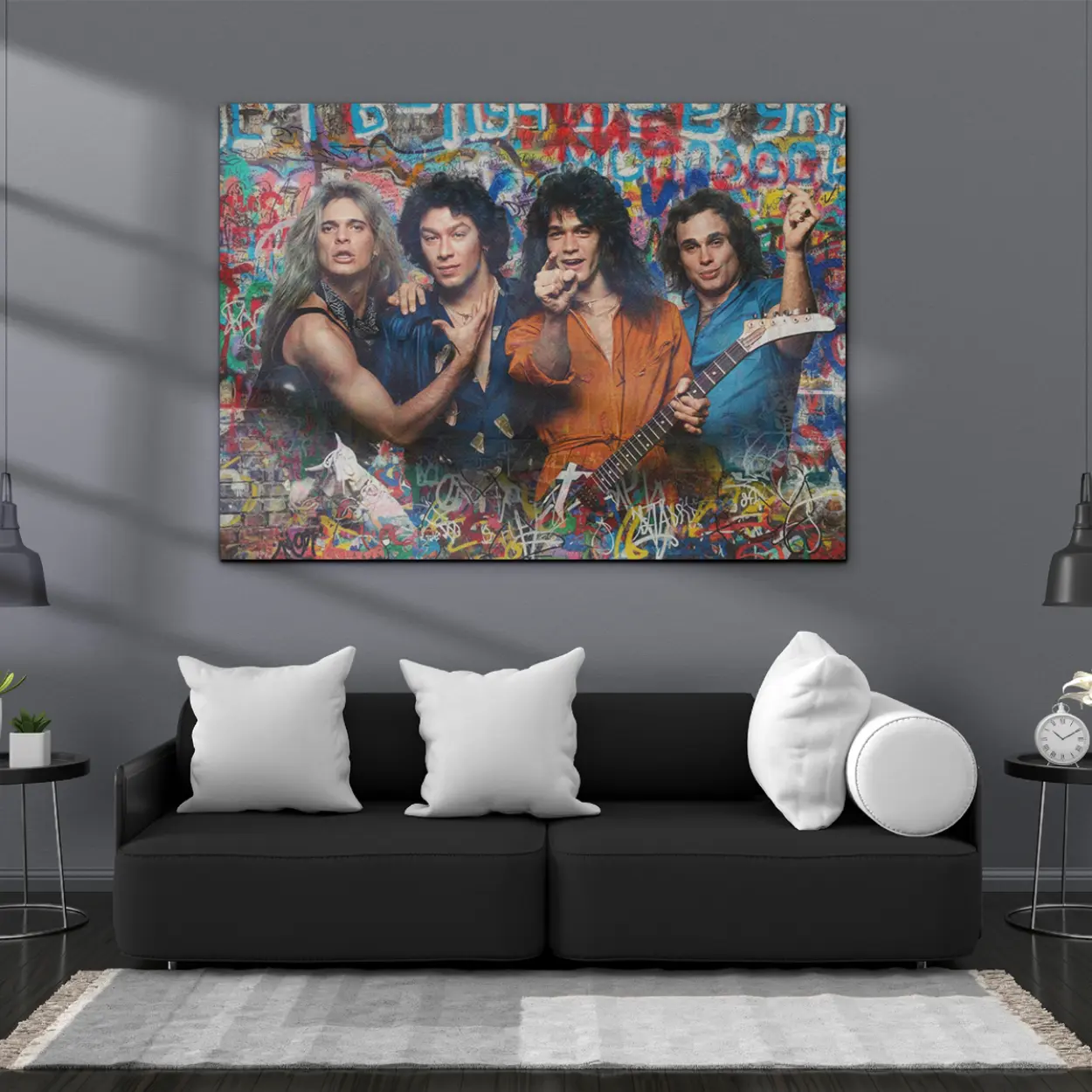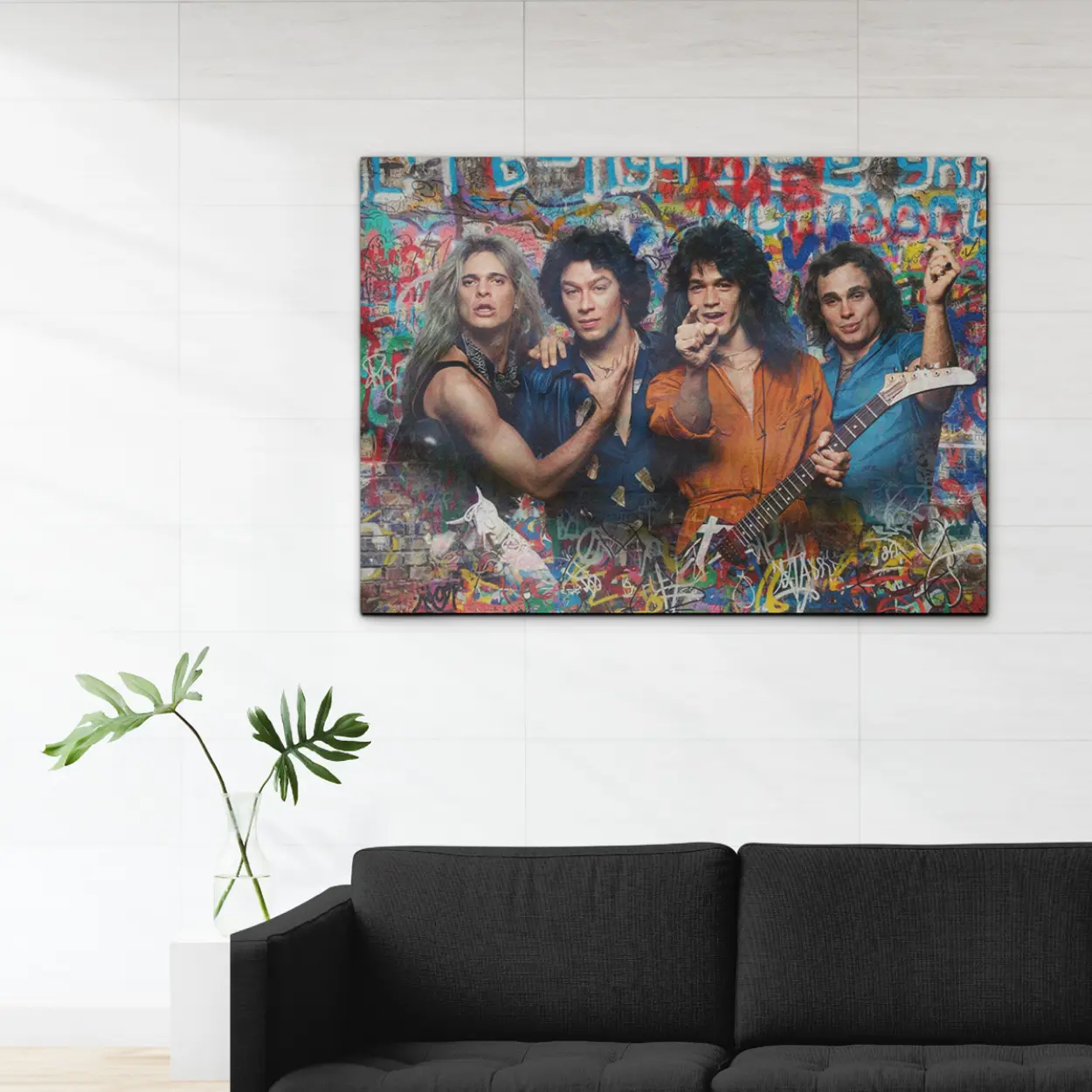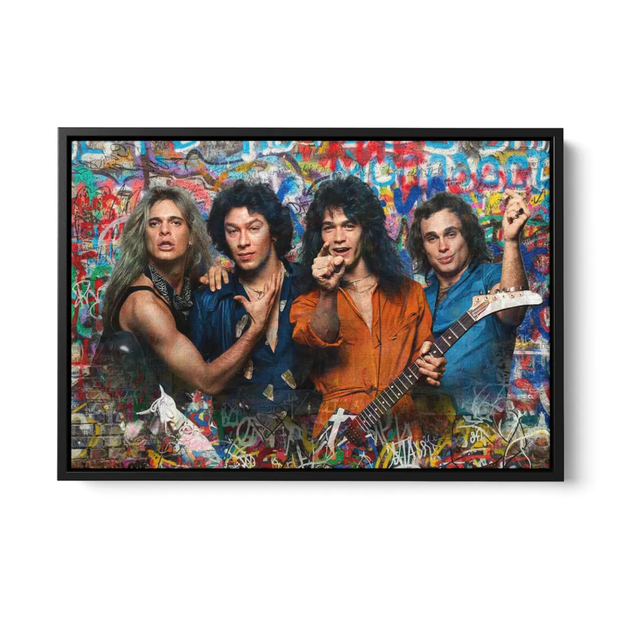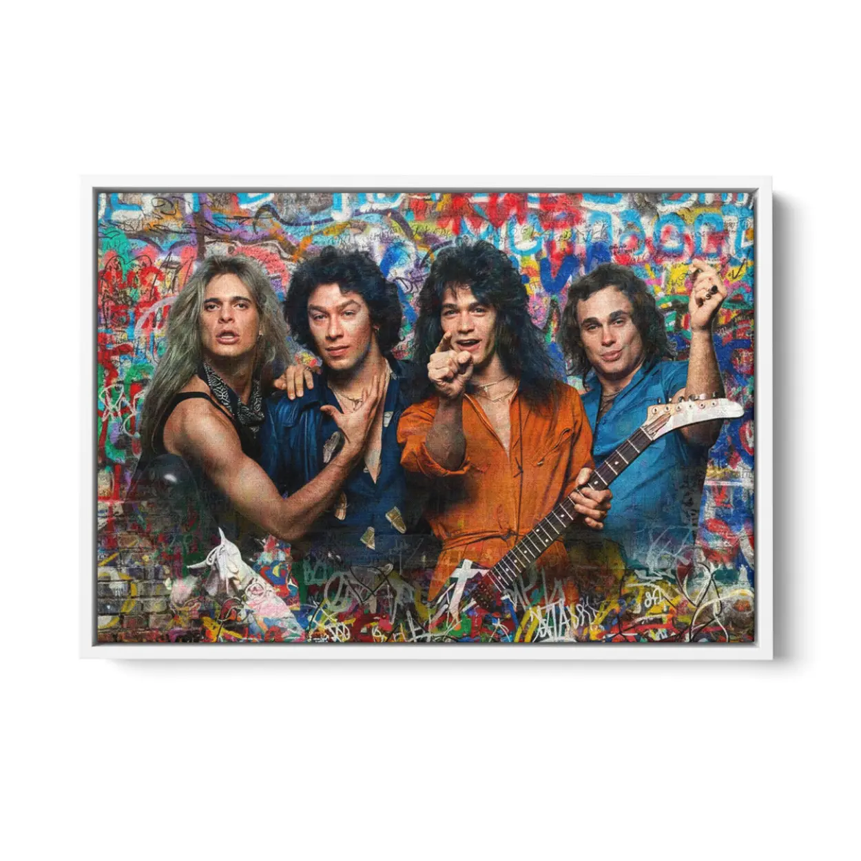 Van Halen Old School Remake graffiti art is available in multiple sizes. Please make sure to measure your space exactly for your art. We make every piece by hand and cannot accept size exchanges. Our internal frames are also available in multiple thicknesses. We offer a .75-inch (standard) or a 1.5-inch (premium) frame with our artwork. Please make sure you look at the example images of both.