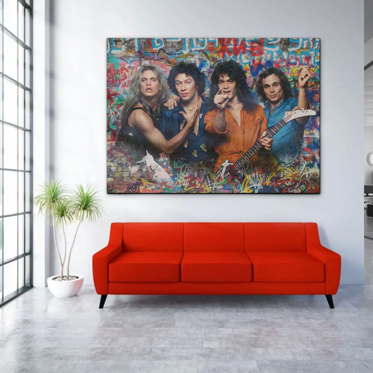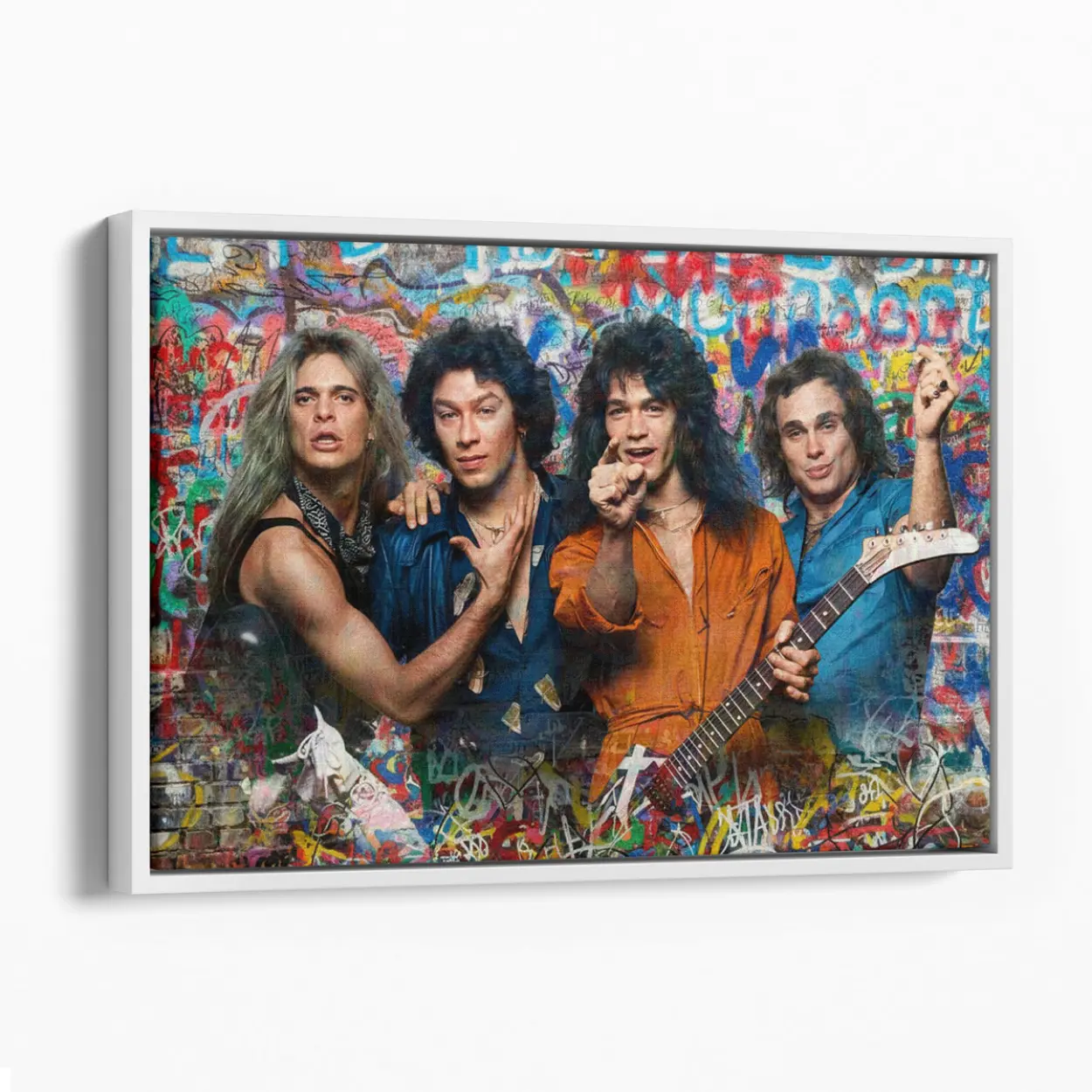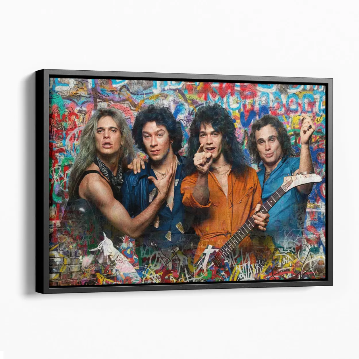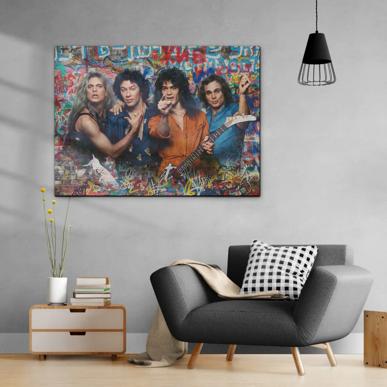 Van Halen Old School Remake graffiti art is available in multiple sizes. Please make sure to measure your space exactly for your art. We make every piece by hand and cannot accept size exchanges. Our internal frames are also available in multiple thicknesses. We offer a .75-inch (standard) or a 1.5-inch (premium) frame with our artwork. Please make sure you look at the example images of both.