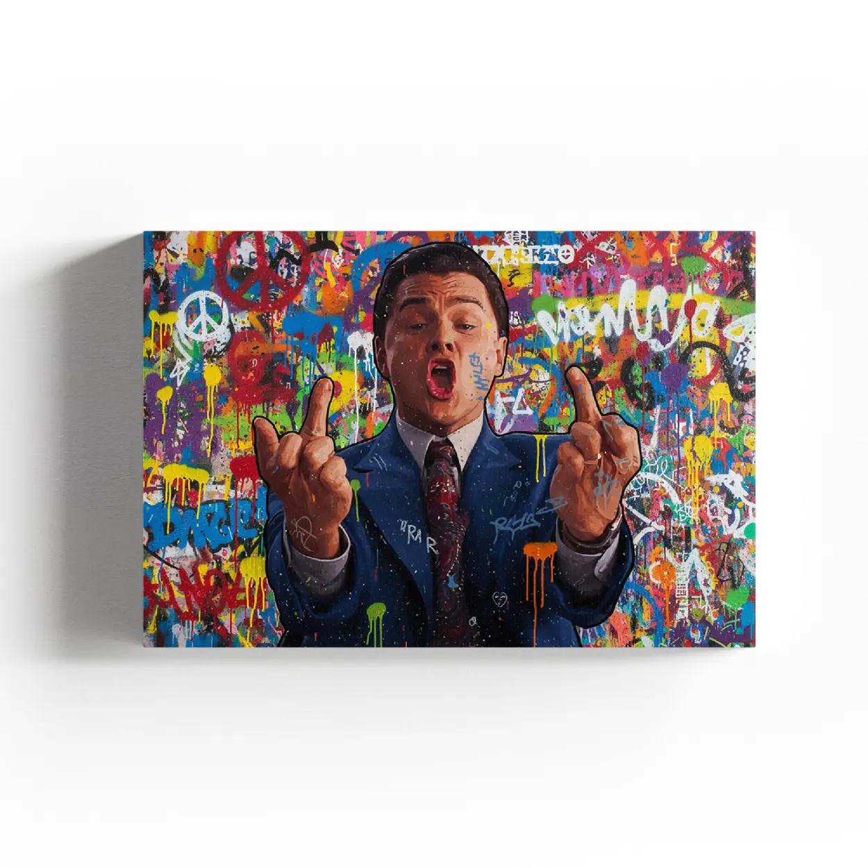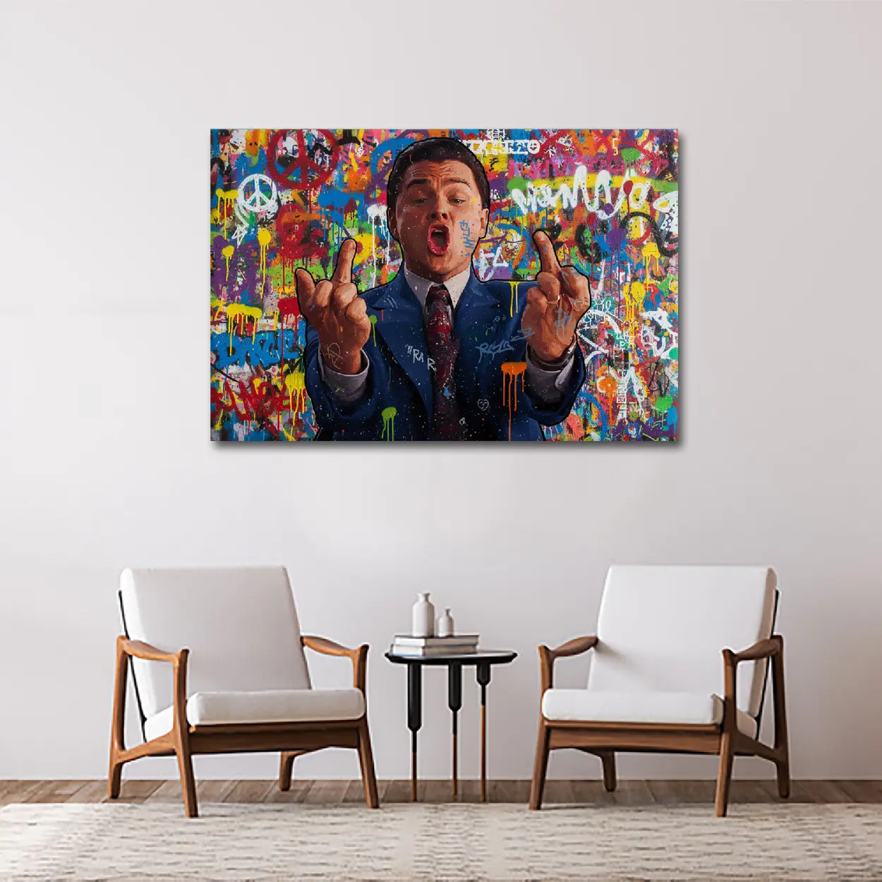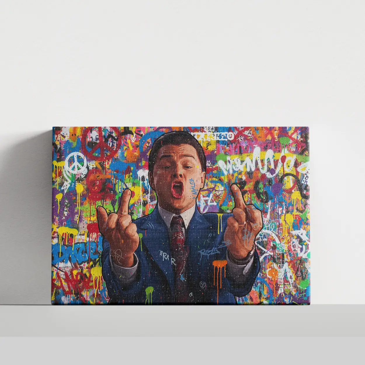 Features the iconic moment of defiance from the movie The Wolf of Wall Street, with Leonardo DiCaprio‘s character making a bold statement against a chaotic, dripping, and colorful graffiti wall background.