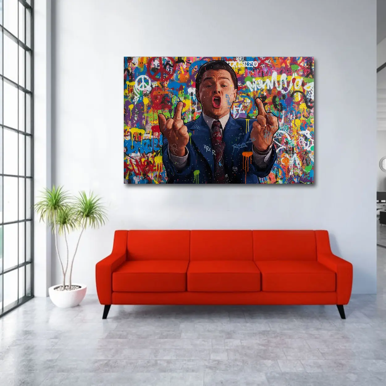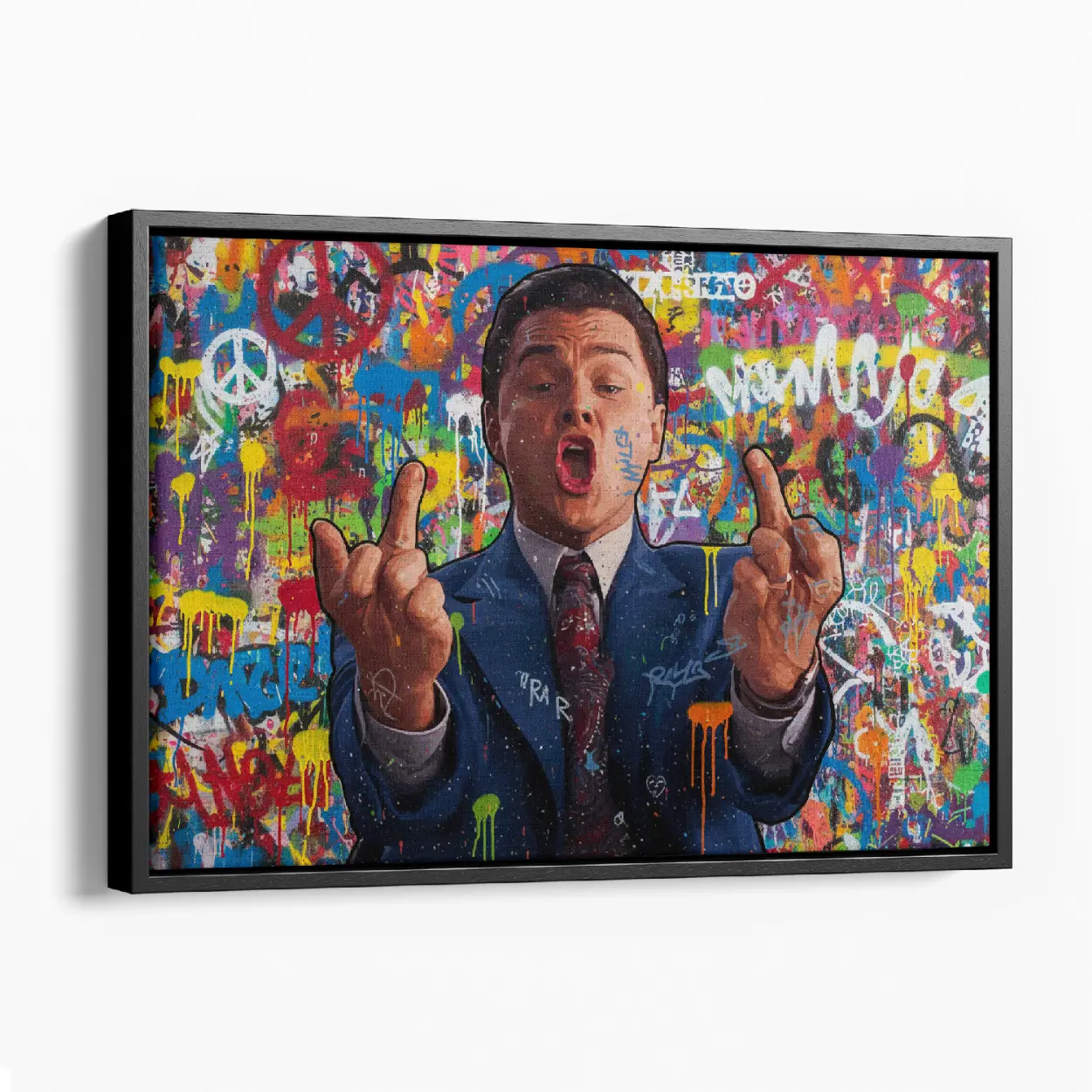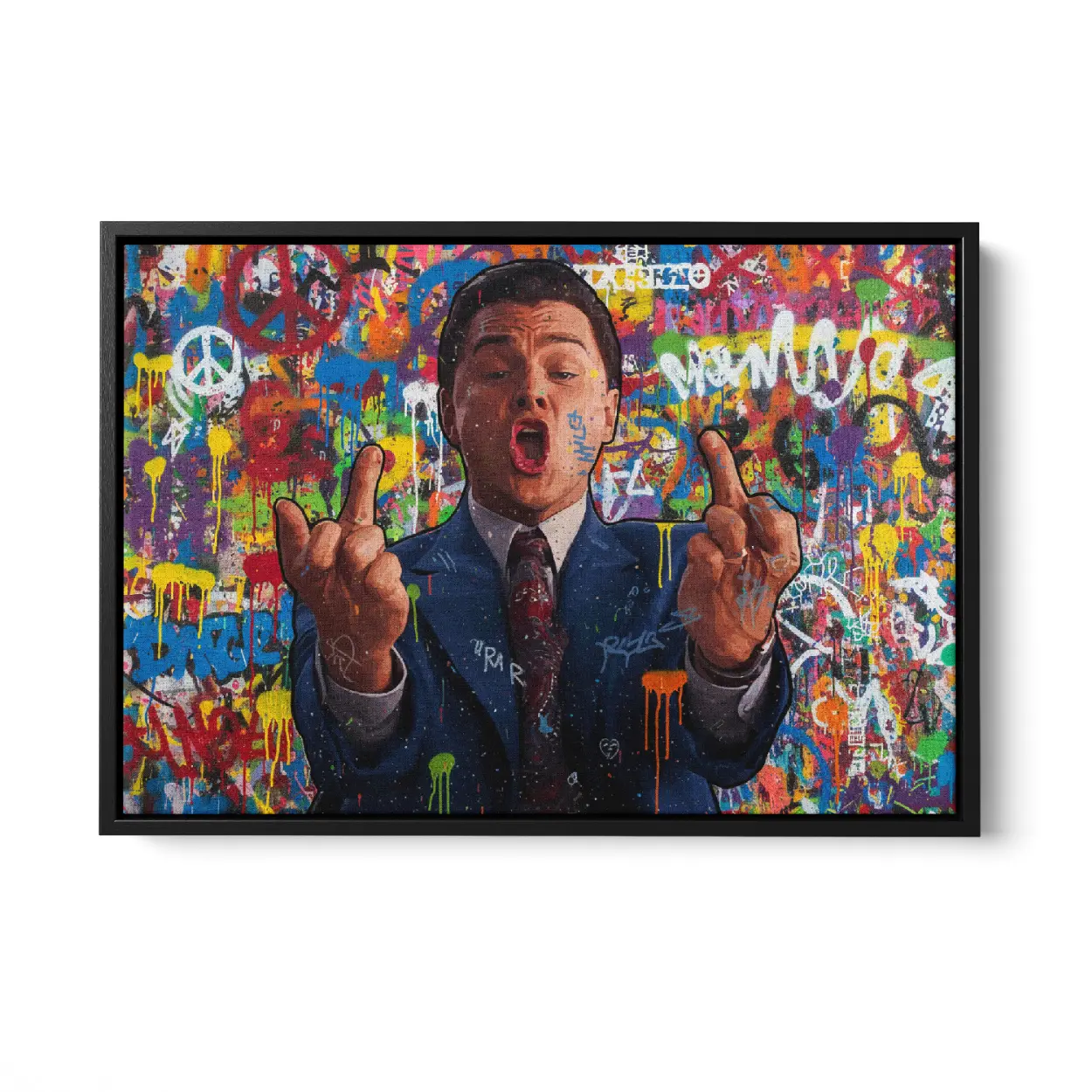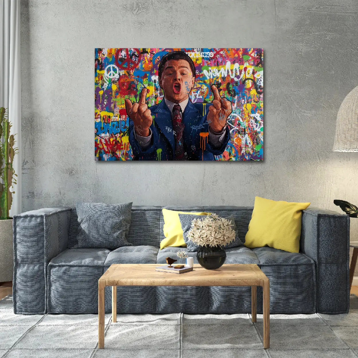 Features the iconic moment of defiance from the movie The Wolf of Wall Street, with Leonardo DiCaprio‘s character making a bold statement against a chaotic, dripping, and colorful graffiti wall background.